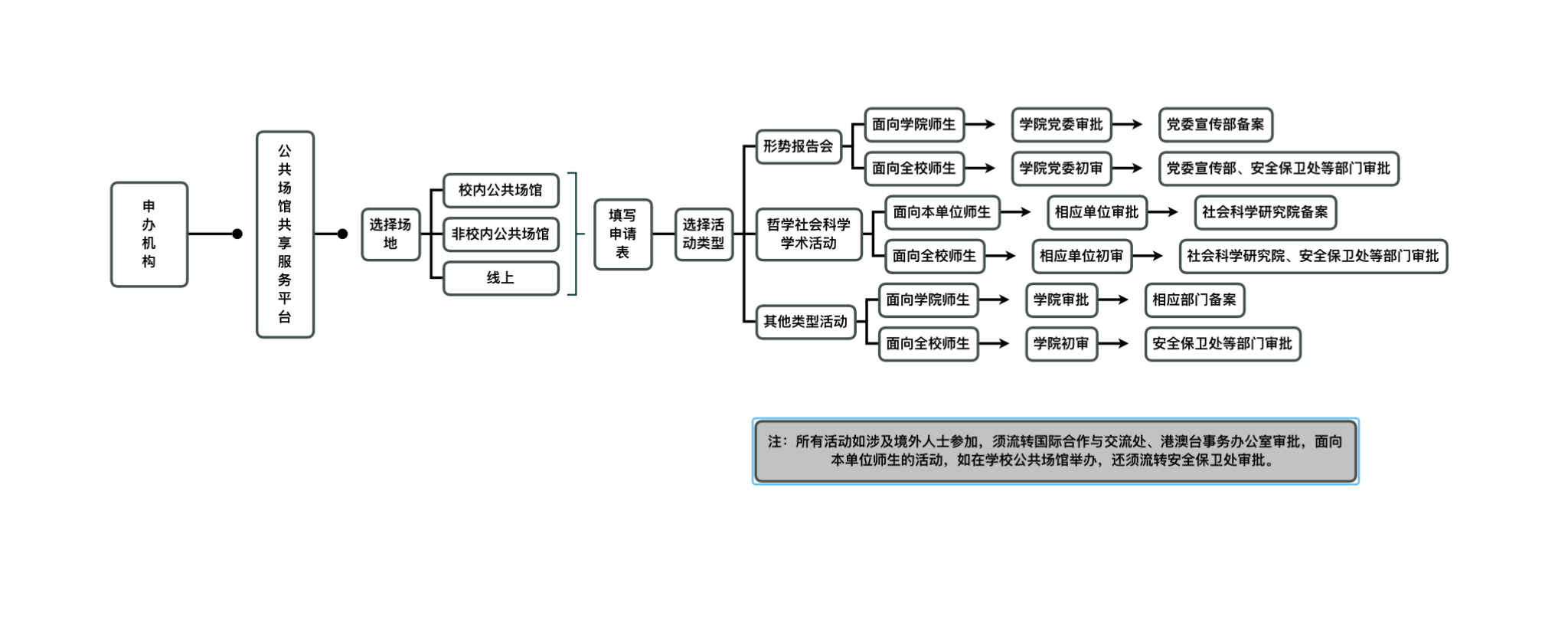 申办机构面向学院师生举办哲学社会科学学术活动,由学院进行审批,审批通过后流转社会科学研究院备案;面向全校师生举办哲学社会科学学术活动,由学院进行初审,通过后流转社会科学研究院、安全保卫处等部门审批。