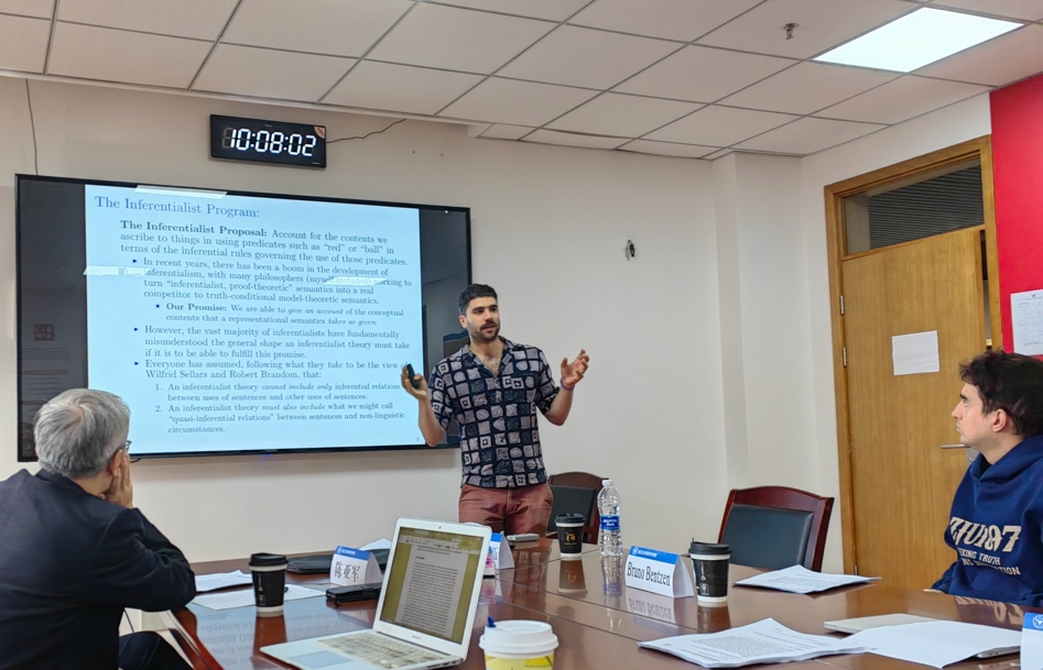 2025年11月3日上午,“实用主义”系列讲座第十讲于浙江大学紫金港校区哲学学院305室顺利举行。本次讲座邀请到武汉大学哲学学院的研究员Ryan Simonelli,讲座题为“How to Be a Hyper-Inferentialist”。浙江大学哲学学院王玮研究员主持了此次讲座,浙江大学哲学学院陈亚军教授、Bruno Bentzen研究员、浙江工商大学董山民教授以及校内外的青年学生参加了此次讲座。