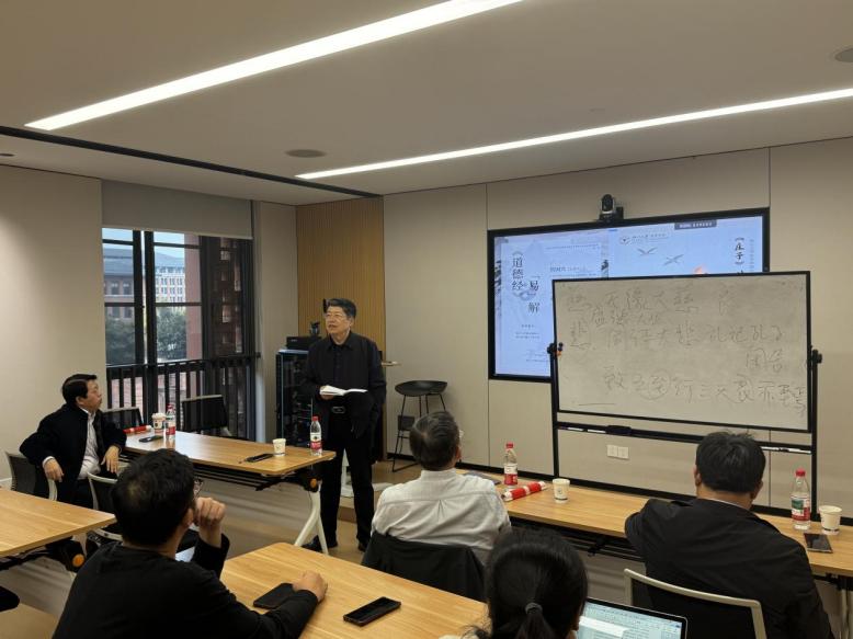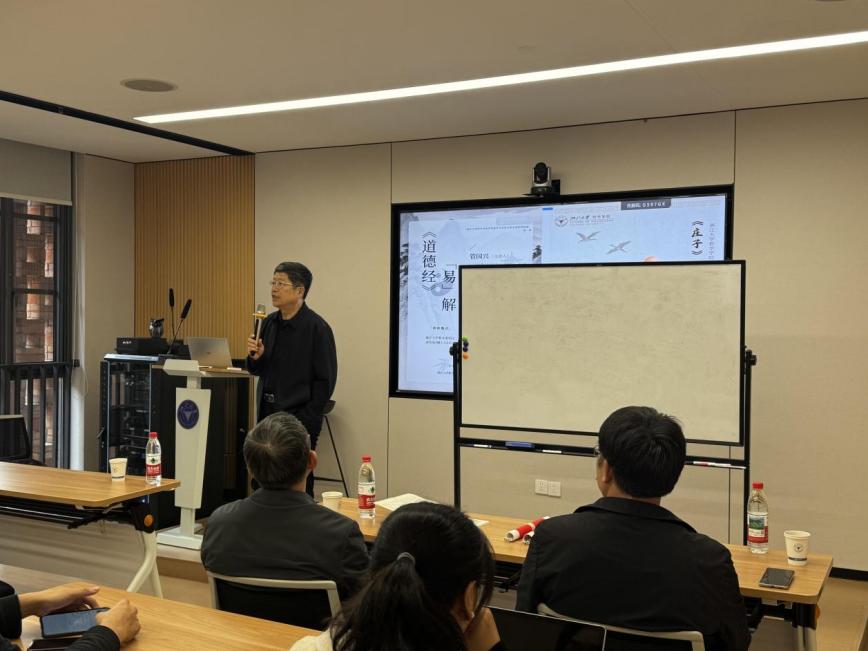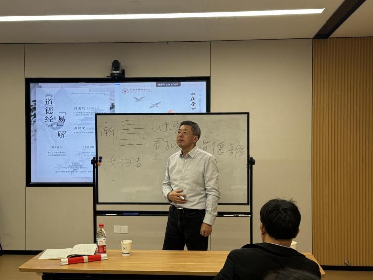 2025年11月5日下午,浙江大学哲学学院举办“中华道学与世界文明互鉴”系列讲座第一讲活动。江苏宏德文化出版基金会副理事长兼秘书长、厦门大学兼职教授管国兴应邀作题为“《道德经》‘易解’”的专题讲座。浙江大学敦和讲席教授盖建民主持,哲学学院党委书记潘贤林出席并致辞。