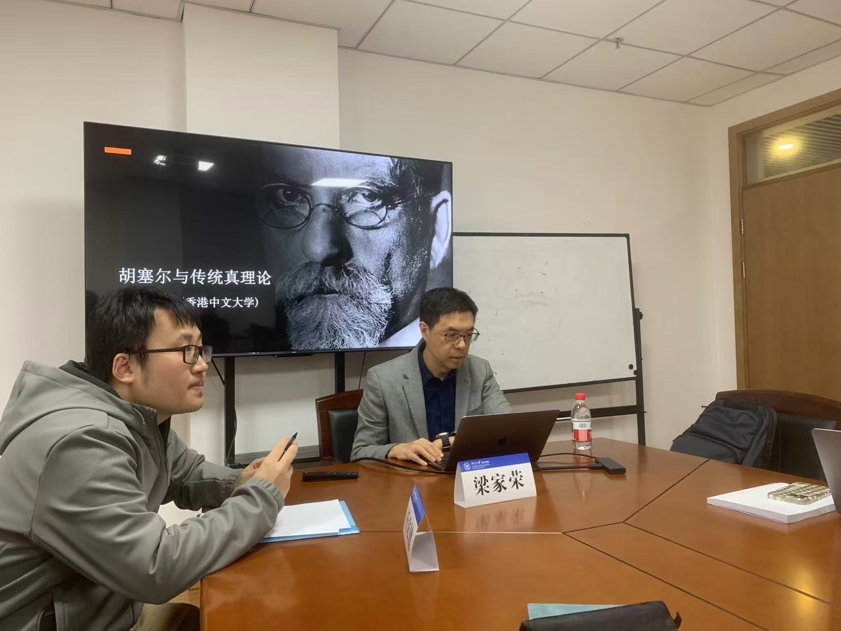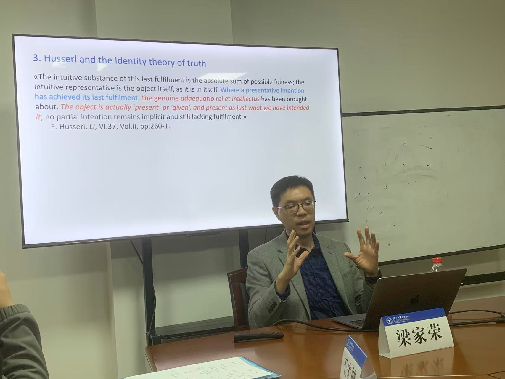 第四讲“胡塞尔与传统真理论”与11月27日下午举行,由浙江大学哲学学院王宏健老师主持。本次讲座的话题是胡塞尔关于真理的看法是否传统说的符合论。梁老师首先介绍了传统的符合论式的真理论的来源与核心看法,即观念与事物的符合。有学者认为,胡塞尔和罗素代表了某种新式的符合论,区别于亚里士多德和阿奎那式的符合论。也有学者认为,胡塞尔的真理论是融贯论,因为他主张的是两种行为之间,即表象行为与感知行为之间的一致。这两种看法都有不足。梁老师认为,胡塞尔的真理论是同一论,他主张的是所意向者与所感知者是完全同一的,所意向者完全就是所感知者。