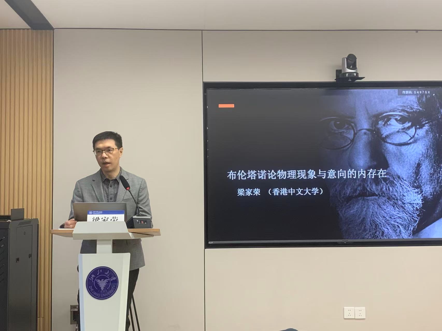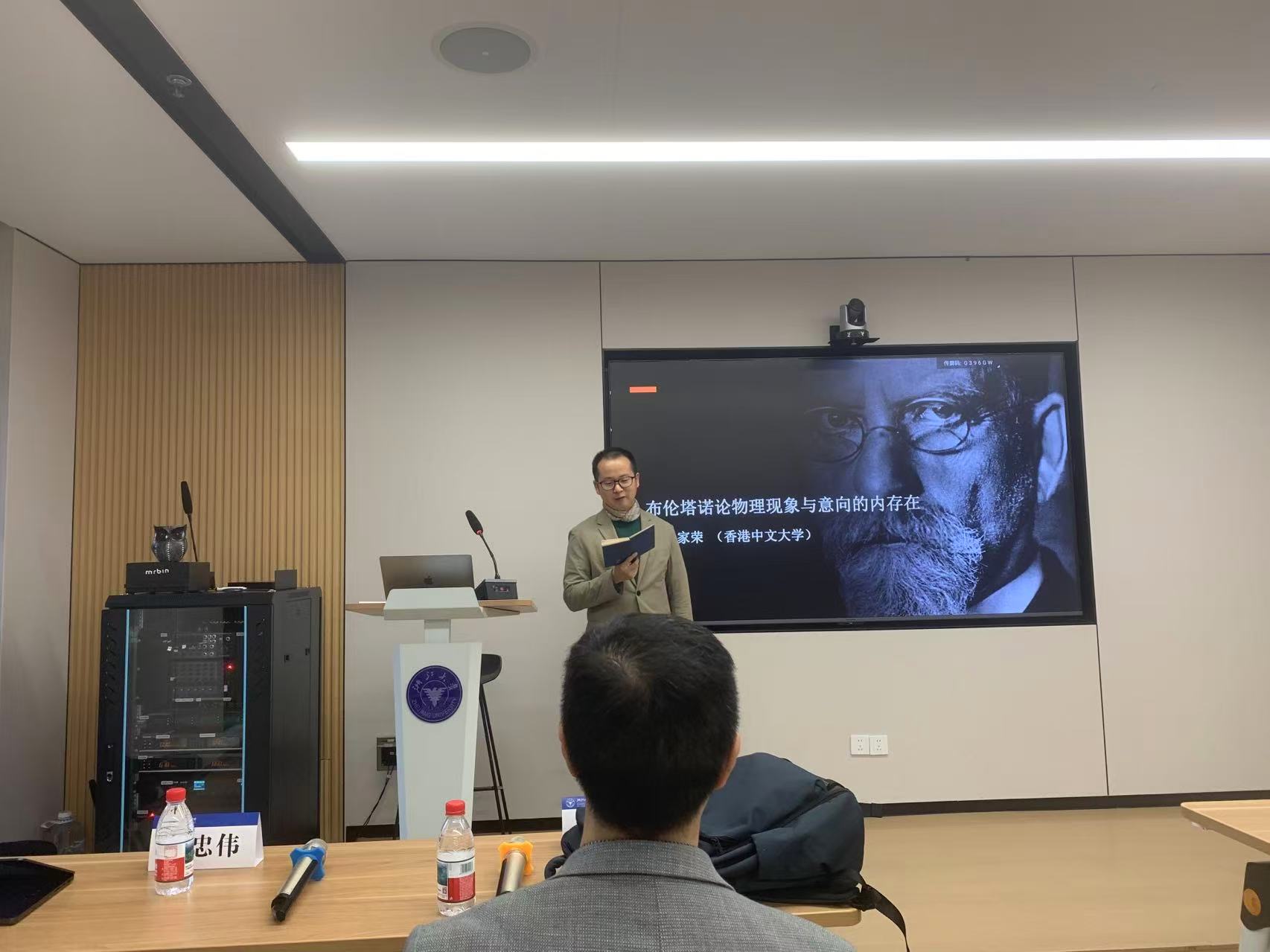 第一讲“布伦塔诺论物理现象与意向的内存在”于11月12日下午举行,由浙江大学哲学学院长聘副教授李忠伟主持。李老师首先对梁老师到哲学学院举行系列讲座表示欢迎,并简单介绍了梁老师的学术成就。本次讲座的话题是布伦塔诺的一个著名区分:物理现象和心理现象。这个区分又引出了一个影响深远的哲学话题:用于刻画心理现象的一个词语“意向的内存在”。梁老师详细讲述了物理现象与心理现象这对区分的缘起,介绍了布伦塔诺研究中对此问题的各种观点,最终反驳了对“意向的内存在”这一说的一种字面解释,即内在于心灵的存在。