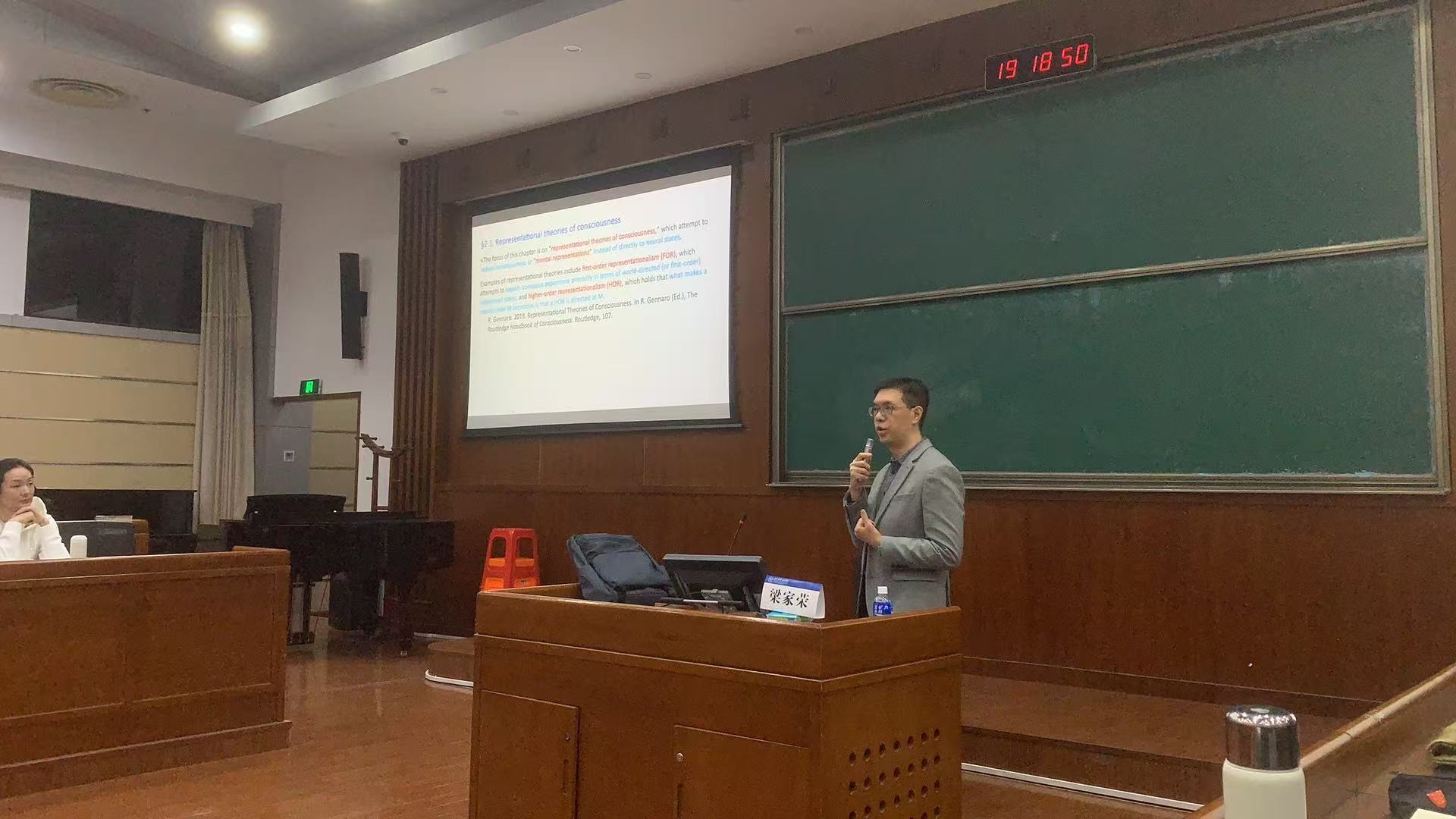 第三讲“胡塞尔与关于现象性意识的表征主义”于11月25日晚举行,由浙江大学哲学学院院长王俊教授主持。本次讲座涉及当代表征主义对经验内容的讨论。当代表征主义对我们经验内容进行了划分,分为现象特性与表征内容两个部分,并进而认为现象特性是表征内容的一种,进而将两者等同起来。而表征内容是指向对象的,这就导致人们认为经验具有某种透明性,因为经验中能找到的内容都是来源于对象的。梁家荣老师反对这种解释,他认为现象特性不能等同于表征内容的一种。梁老师进而举出胡塞尔对经验内容的划分以说明自己的看法。胡塞尔在《逻辑研究》中也对经验内容进行了划分,分为质性、质料和充盈三个部分,并认为这三个部分彼此间不可还原。梁老师认为,质性大致对等于当代表征主义说的现象特性,质料大致等同于表征内容。按胡塞尔的看法,质料与质性彼此间不可还原,再加上充盈的存在,更加说明,表征主义者将现象特性还原为表征内容的做法是有问题的。